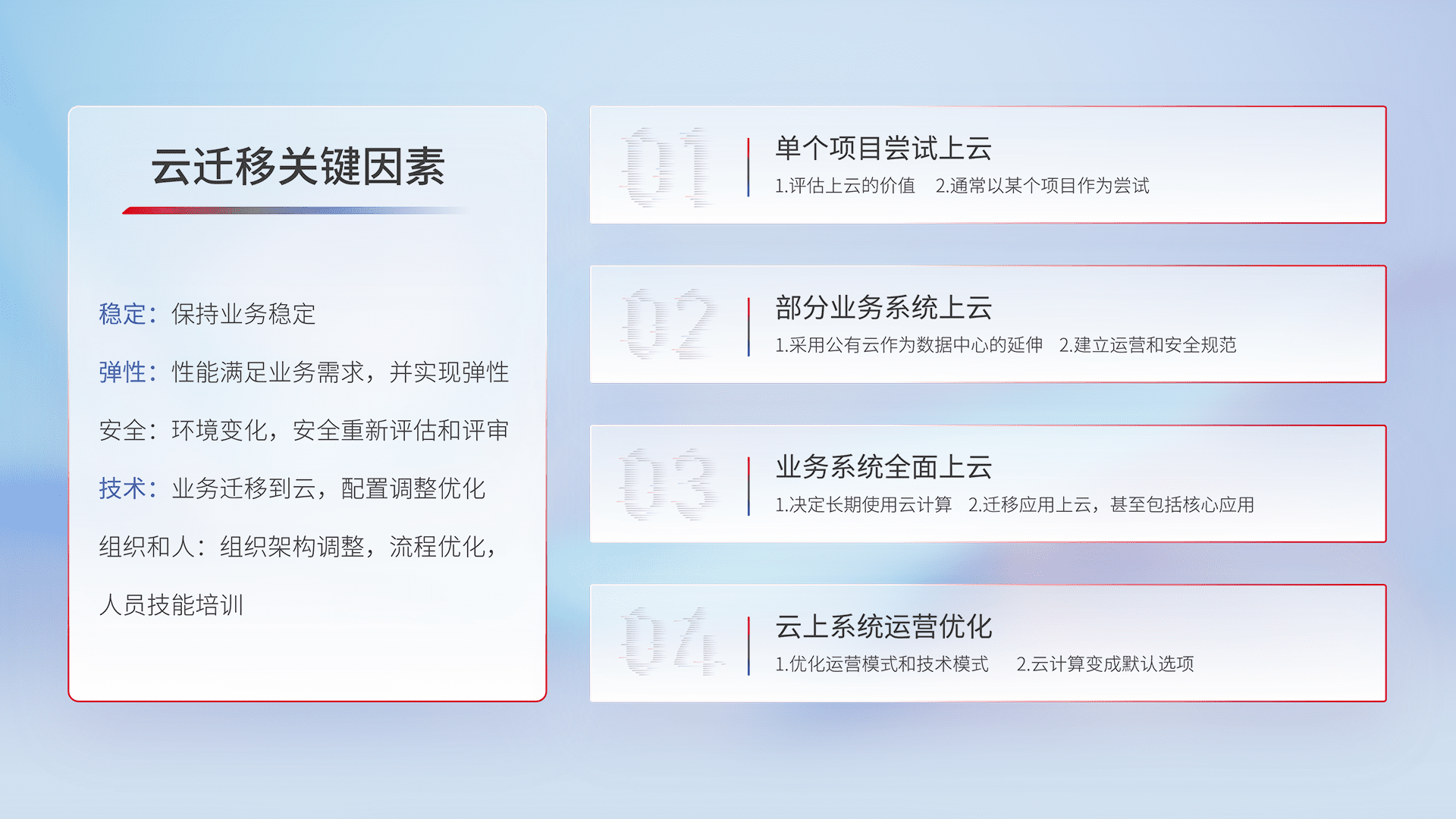 结合实际业务,,从规划设计、、、云平台选型、、、云原生改造、、、、数据迁移、、、集成交付,,,,迁移全过程为客户识别最佳上云路径,,,,做好风险识别管理,,,,设计网络架构、、、、身份权限、、、安全审计合规、、、操作审计、、、、日志审计、、、监控告警策略、、、多站点容灾设计等,,,,对云上基础设施进行整体规划,,,,提升IT治理水平,,,,以满足弹性、、高可用、、、、高性能的需求。。。。